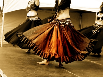 Dahlia Moon does “modern Egyptian” belly dance, which is a very elegant style associated with movie and cabaret performances. Delilah, who founded Visionary Dance and teaches Power Belly, does what’s called American Style, but I’m told she does a take on it that’s uniquely her own. There’s a third style called American Tribal that has New Age and, sometimes, Goth elements; the photo (above) is of Tribal belly dancers.