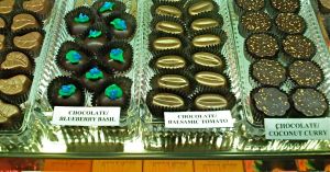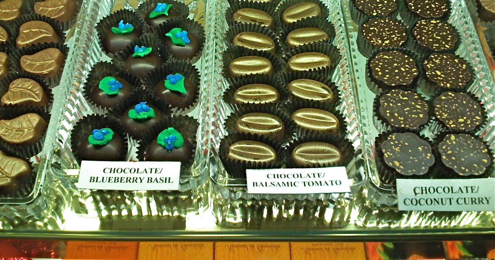 After brunch we popped into Rose’s Chocolate Treasures to buy truffles and ooh and ah at the antique hot chocolate sets for sale (these look like tea sets, except both the pots and the cups are tall and narrow). No, I didn’t try the chocolate blueberry basil or the chocolate balsamic tomato truffles pictured here. I had the “plain” toasted coconut truffle.